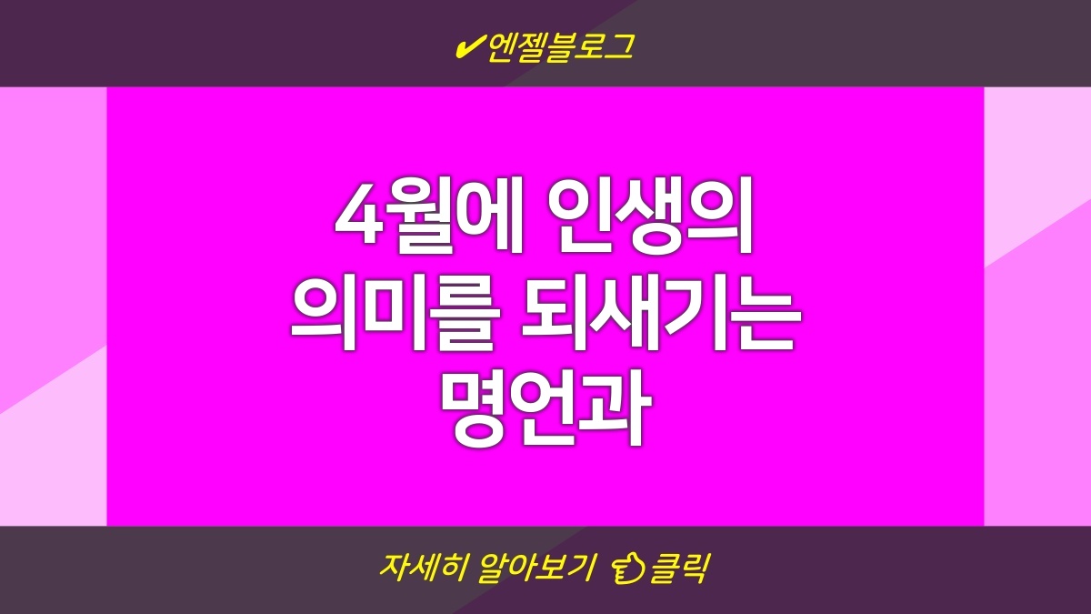4월은 희망과 새로운 시작의 달입니다. 이때의 명언들은 우리에게 중요한 힌트를 제공합니다. 명언들이 전하는 메시지를 통해 긍정적인 변화를 이끌어낼 수 있습니다. 매일 자신을 돌아보고 더욱 나은 자아로 발전할 수 있도록 노력하세요. 또한, 주변 사람들에게도 긍정적인 영향을 미치며 함께 성장하는 경험을 해보세요.